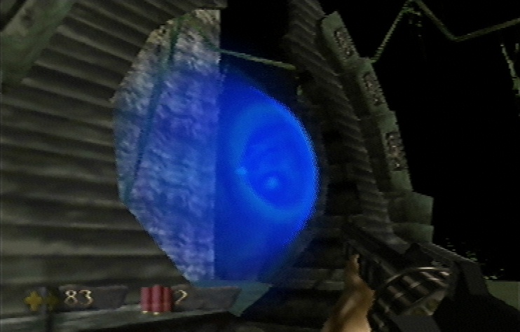 of transparency.Multiple objects in one's line of sight can have their transparency and colour values combined; this permits one to model situations such as looking out of a window at an object sitting on the bottom of a swimming pool: the window has transparency and so does the water, so one must be able to see through both. In this example, the water may also have a degree of depth-cueing to model the water's cloudyness at increasing depths or lateral distances. The image above shows Turok employing depth-cueing in this way; the transparency is obvious from the fact that the tops of the rocks (which are above the water) can be seen from beneath the water's surface.