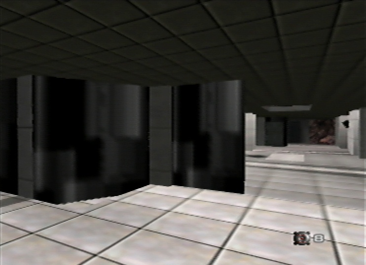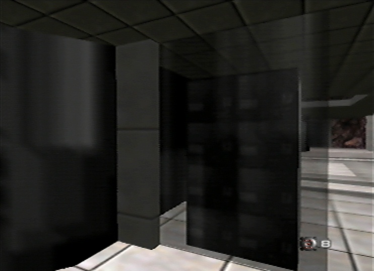Another point about Goldeneye: on the 'Library' level, there is an area where many small 'office' rooms have transparent windows, but the windows are also partially reflective. Unlike the images above, however, the windows in the office area are dominated by their transparency rather than by their reflectivity. This shows that a designer can determine to what degree the various special effects will decide the final appearance, how they combine, and at what distances the different effects will be prominent. Importantly, notice that one can see through more than a single window to a far wall, yet both windows still show their reflectivity. From a game-playing point of view, it's also interesting that the game properly models the presence of the multiple windows: fire a single bullet through the windows at a far wall - you will see a hole in each window and a bullet mark on the far wall, all correctly lined up.