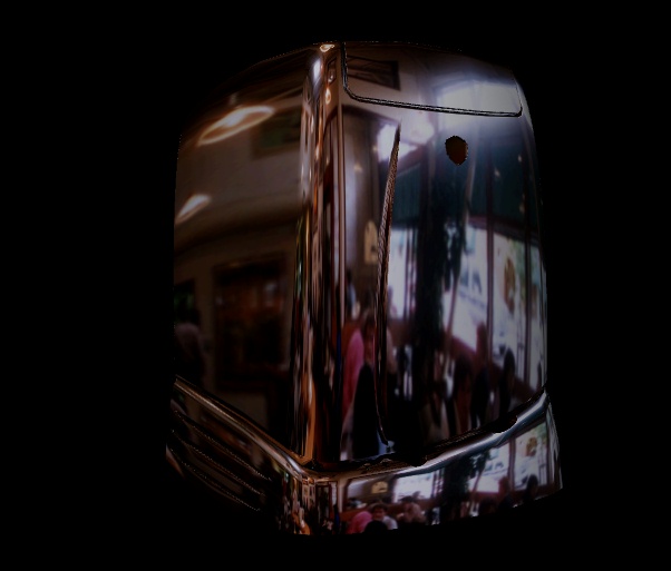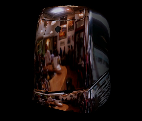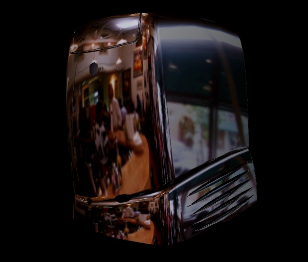 The example image shown at the top of this page uses the second technique: it shows a spiral-shaped object reflecting a photograph of a restaurant scene. Click on the image to download a much larger version. Below is a final, much clearer example: four different views of the SGI O2 computer chassis, reflecting a restaurant/bar scene.