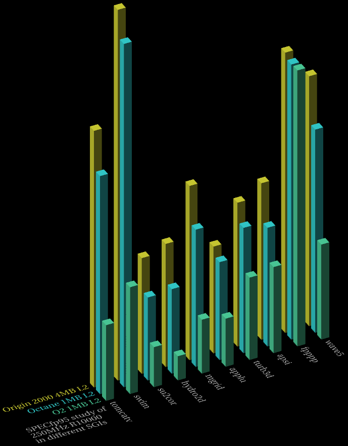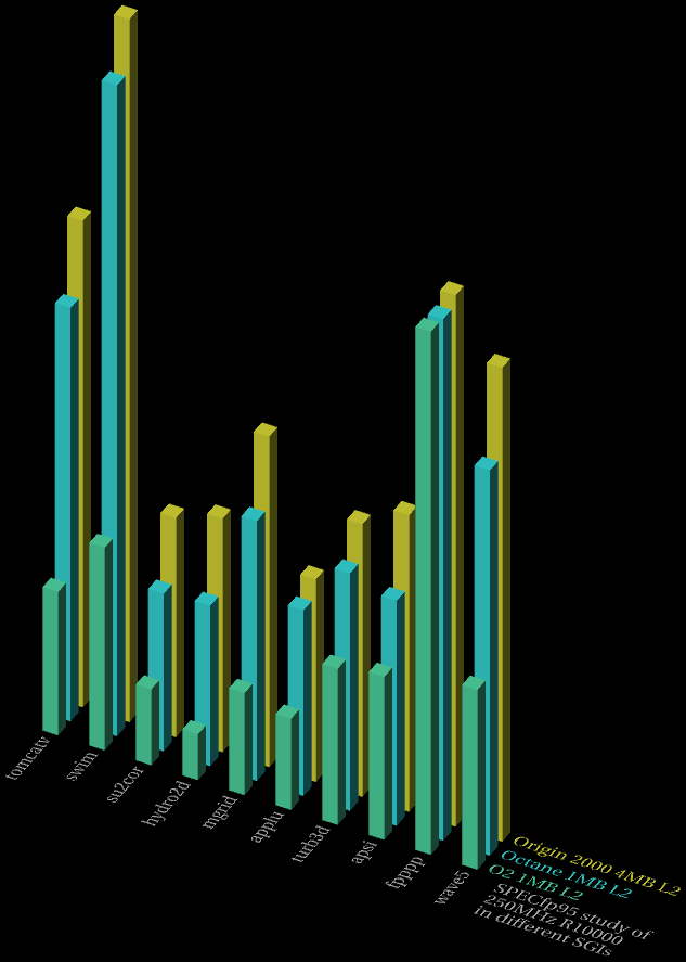 Given below is a comparison table of the various R10000/250 SPECfp95 test results. Faster systems are leftmost in this table (in the Inventor graph, they're placed at the back). After the table and 3D graphs is a short-cut index to the original results pages for the various systems.