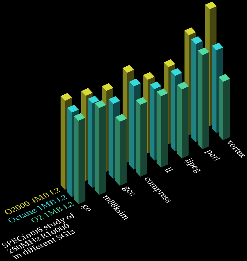 Possible tip: if you're running int processing jobs on Origins, Octanes and O2s, try swapping the jobs around. You might get better performance for some of the tests because they may benefit from Origin's larger L2, or the better memory latency and outstanding cache miss support of Origin/Octane, etc. Meanwhile, a task like m88ksim which doesn't seem to benefit from these extra features would run just as well if it was moved from an Origin/Octane to O2. Thus, one could increase the performance of some tasks without making the remaining tasks any slower than they originally were. An extreme example would be if one had m88ksim-type task running on an Origin (call it task X) and a vortex-type task running on an O2 (task Y) - swapping the tasks over would give the same performance for task X, but task Y would speed up by a significant margin.