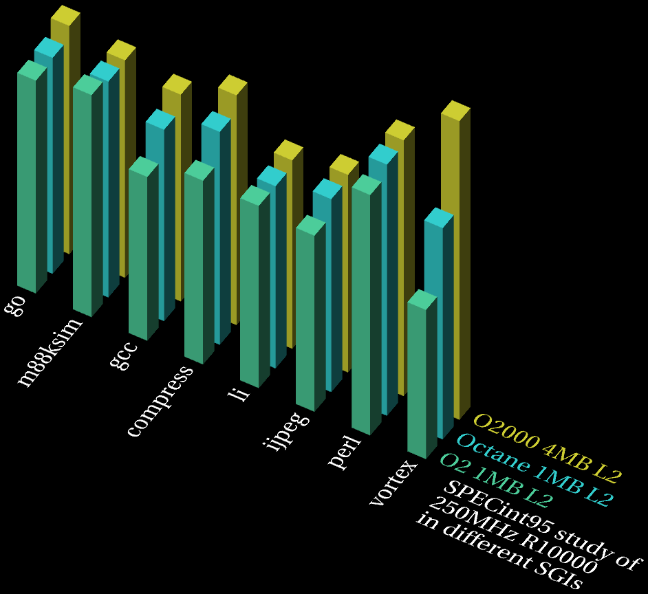 The rationale and method for this examination were the same as for SPECfp95. Thus, given below is a comparison table of the various R10000/250 SPECint95 test results. After the table and 3D graphs is a short-cut index to the original results pages for the various systems.