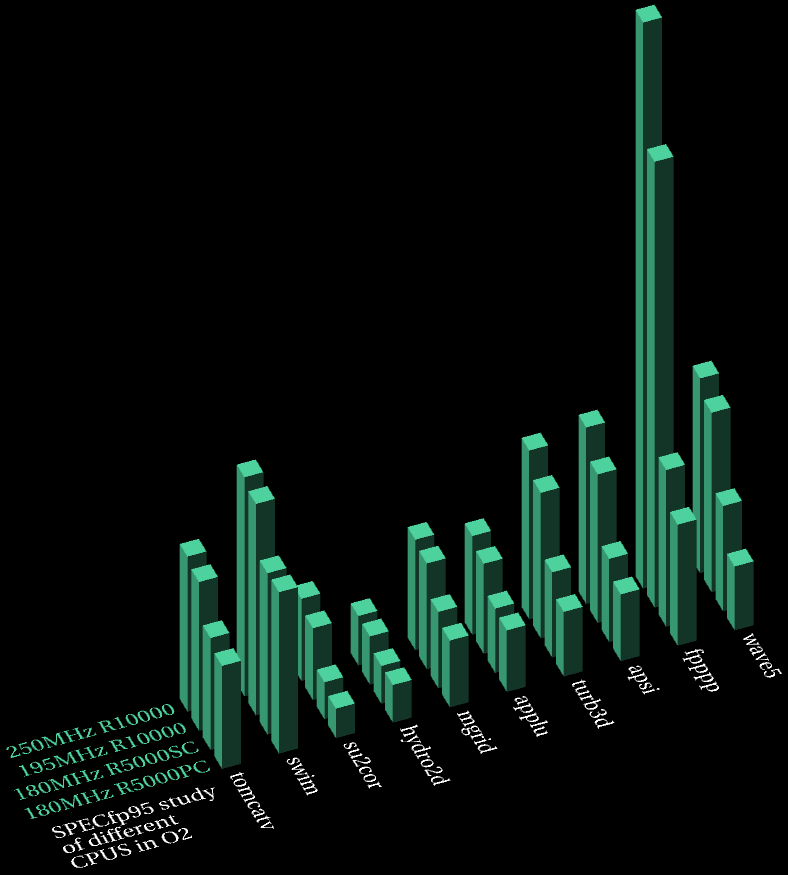 Given below is a comparison table of available SPECfp95 test results for O2. Faster CPUs are leftmost in the table (in the Inventor graph, they're placed at the back). After the table and 3D graphs is a short-cut index to the original results pages for the various systems.