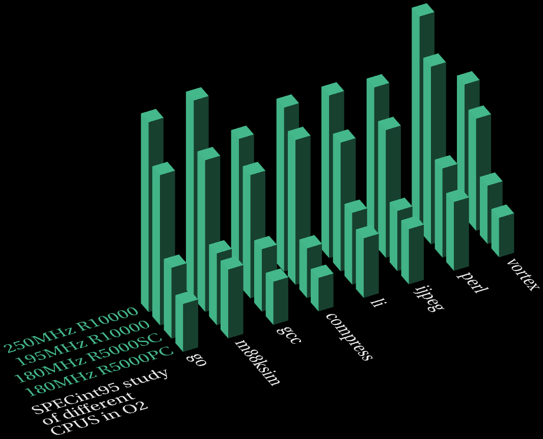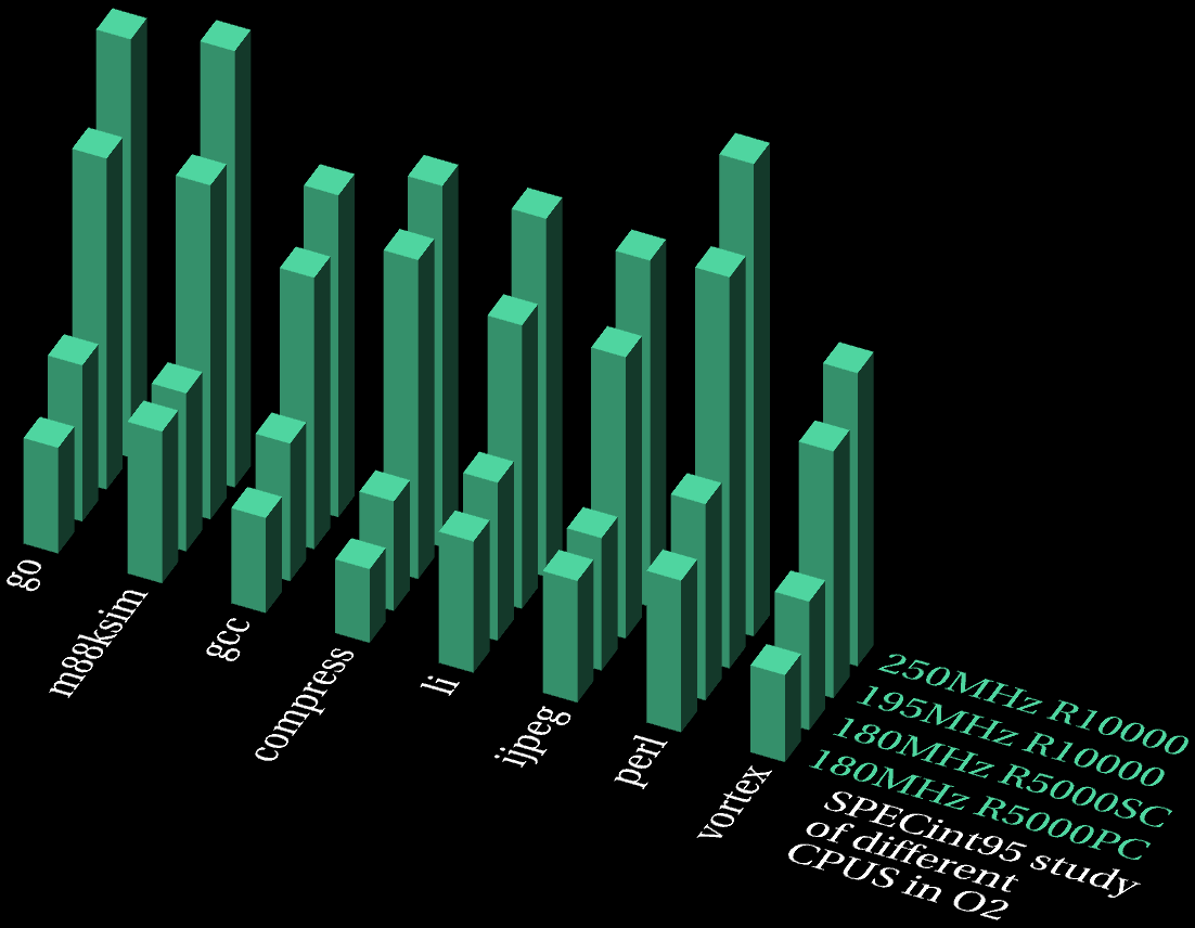 This analysis examines how different CPUs perform in O2, ie. the focus is on how different R5000s and R10000s perform in the same system, in this case O2 (I have separate pages dealing with how the same CPU performs in different systems).