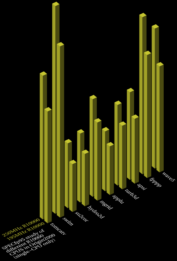 Given below is a comparison table of available single-CPU R10000 SPECfp95 test results for Origin2000, covering 195MHz and 250MHz versions; for reference, an equivalent percentage increase is also included for each test, plus a final average percentage increase. Faster CPUs are leftmost in the table (in the Inventor graph, they're placed at the back). After the table and 3D graphs is a short-cut index to the original results pages for the various systems.