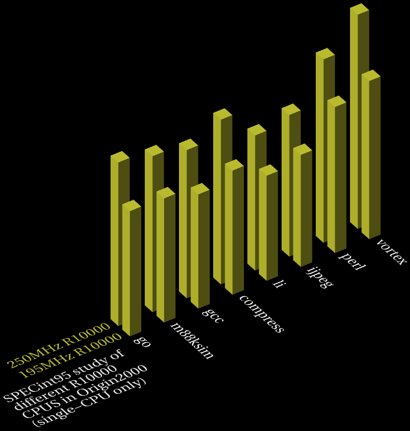 This analysis examines how different R10000 CPUs perform in Origin2000 for single-CPU performance only, ie. the focus is on how different R10000s perform in the same system, in this case Origin2000 (I have separate pages dealing with how the same CPU performs in different systems).