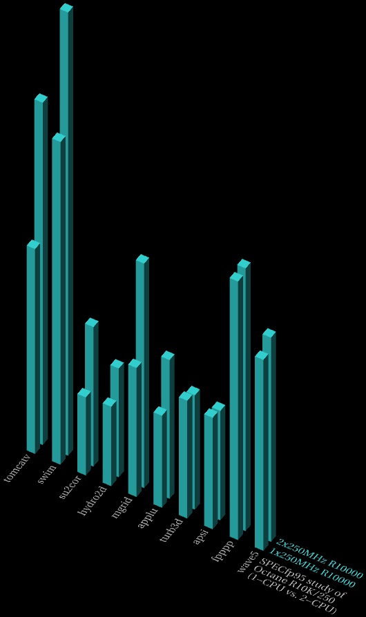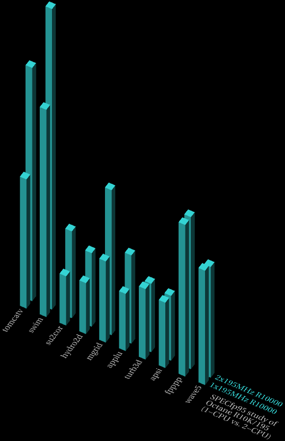 Given below is a comparison table of available single vs. dual R10000 195MHz SPECfp95 test results for Octane. Faster configurations are leftmost in the table (in the Inventor graph, they're placed at the back). After the table and 3D graphs is a short-cut index to the original results pages for the various systems.